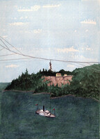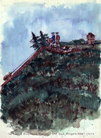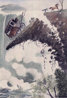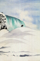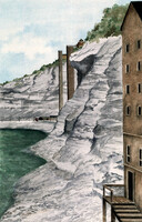 American Falls, Incline Railway and Ferry Stairs in Winter Niagara Falls Heritage Foundation Government of Canada Local Initiatives Grant AK 2403-9 1974 - 1975 ; Research by George Seibel ; artistic recreation from a sterograph in the private collection of Thomas Mahoney, Buffalo, NY ; In 1844 the winding stairs at the landing on the US side were augmented by an Incline railway cut into the Gorge bank at the top, opereated by water power. A stairway was incorporated into the structure, running beside the Incline tracks ; F-7 ; -