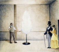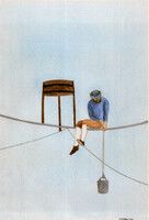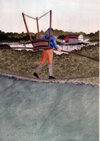 Farini as Biddy O'Flaherty the Irish Washerwoman Niagara Falls Heritage Foundation Government of Canada Local Initiatives Grant AK2403-9 1974 - 1975 ; Research by George Seibel ; On September 5th, 1860. Farini as Biddy O'Toole the Irish washer woman carried the patent washing machine to the centre of the rope, positioned it and then drew up water from the River to fill the mahine. He then proceeded to wash a number of handkerchiefs given to him for that purpose by ladies who were part of the crowd, excerpted from the Niagara Falls Gazette ; artistic recreation from a stereograph by Platt D Babbitt ; courtesy Niagara by Ralph Greenhill and Thomas D Mahoney ; -