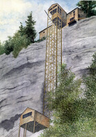 The elevator at Whirlpool Rapids Niagara Falls Heritage Foundation Government of Canada Local Initiatives Grant BK 4701-1 1975 - 1976 ; from a stereograph in the Earl W Brydges Public Library, Niagara Falls, NY ; research by George Seibel ; 2P-24 ; -