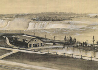 Ontario Power Generating Station Table Rock House (left), Murray Hill (centre), Lower Niagara River in foreground ; -