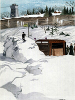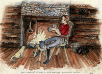 Fred's cabin at the Ice Bridge Niagara Falls Heritage Foundation Government of Canada Local Initiatives Grant AK 2403-9 1974 - 1975 ; artistic recreation from a stereography by George Barker in the Earl W Brydges Public Library, Niagara Falls, NY ; research by George Seibel ; Men of opportunity erect shanties, some of them dignified with the name of hotel, on the ice bridge, along the path. These buildings are a wonder. They spring up in a day, in an hour in fact. Their only foundation is the ice and each one has nearly 200 feet of water in the "cellar" ; -