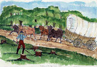 Traffic on Portage Road Oxen pulling covered wagon ; -