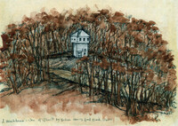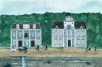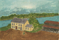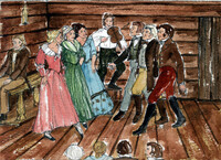 A Social Gathering At The Whirlpool House Portage Road Niagara Falls Heritage Foundation Government of Canada Local Initiatives Grant AK 2403-9 1974 - 1975 ; Research by George Seibel ; The Whirlpool House built about 1800 by Andrew Rorback was a stage coach stop and as well a popular place to hold meetings and social affairs. This watercolour depicts a social evening, a dance, one of many held in the upper rooms of this building ; Artistic recreation from a sketch by C W Jefferys in Library and Archives Canada ; -