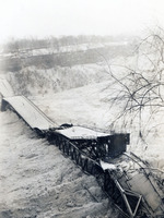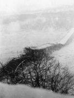 Collapsed Falls View Bridge On January 27, 1938 an ice jam, exerting enormous pressure on the abutments of the Falls View Bridge, caused it to collapse onto the ice bridge below. -