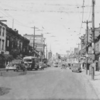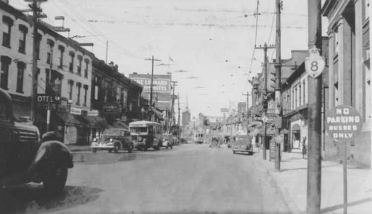 - buildings, hotels, signs, cars, buses, streetcars, Leonard