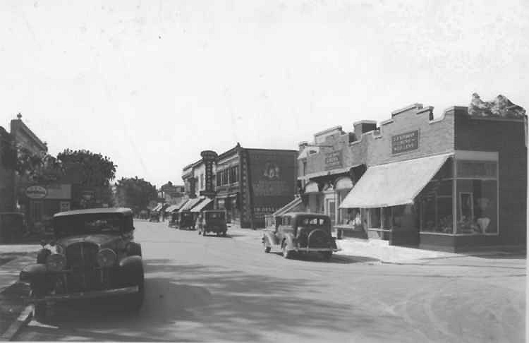 - en-CA H. B. Dell & Son Hardware and Furniture Store ( centre) ; Ford W. G. Willson Service Station Imperial Dealer (left) ; ? China & Silverware Store ( (2nd from right); D. D. Kinsman Linens & Woollens Store (right) ;