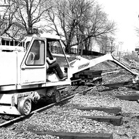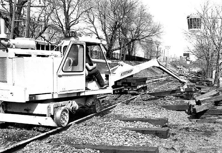 - en-CA Conrail track crews and equipment carry out an oak tie replacement program in Niagara Falls, April 1981. Minolta Tower is in background.