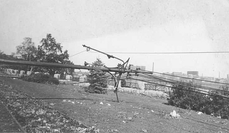 Damage to streetcar power lines in Queen Victoria Park caused by a cyclone