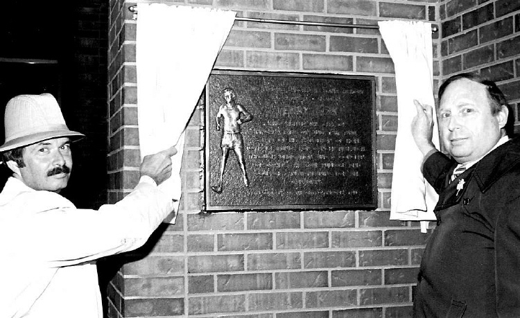 - Mayor Wayne Thompson & Eugene Oatley at City Hall with Terry Fox Plaque