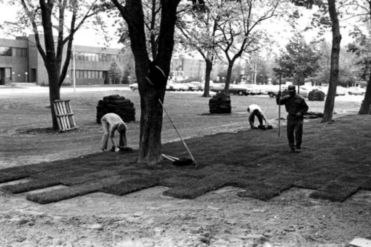 Landscape workers laying down sod in front of the new Niagara Regional Police Station on Morrison Street