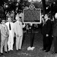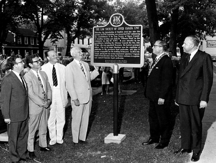 - en-CA Left to Right: Honorable Robert Welch, Q.C. Provincial Secretary and Minister of Citizenship; Professor W.S. Goulding, representing Ontario's Historic Sites Board; Brigadier Willis Moogk, O.B.E., President, Niagara Historical Society; Honorable W. Ross Macdonald, P.C., C.D., Q.C., LL.D., Lieutenant-Governor pf Ontario, who unveiled the plaque; His Worship W.E. Theobald, Lord Mayor of Niagara; and Mr. W.G.C. Howland, Q.C., Treasurer of the Law Society of Upper Canada