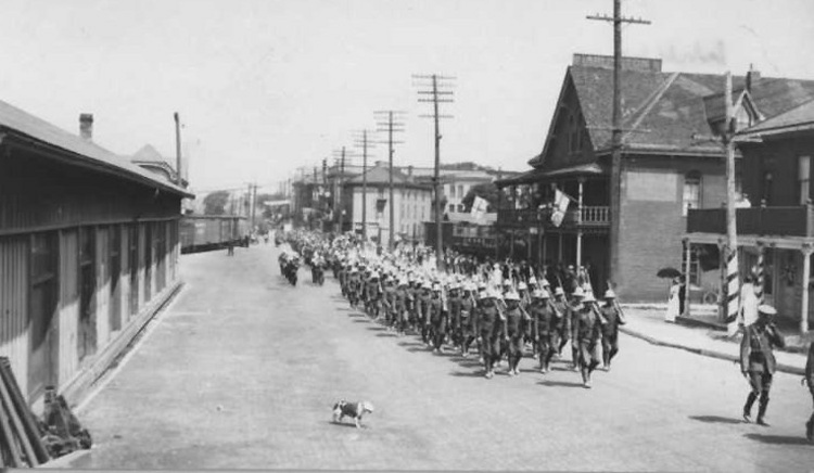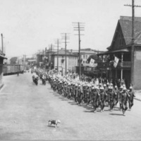 - Soldiers marching along Bridge Street, Railway Station (left)