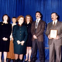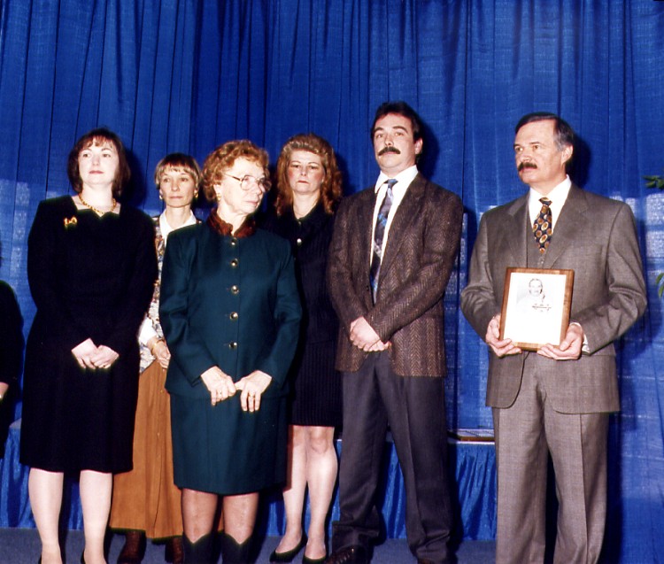 - Mayor Wayne Thomson (right) presenting plaque to unidentified family members