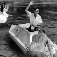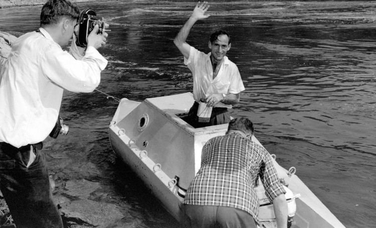 Ray Weaver being passed a gas can at the edge of the Whirlpool Rapids after his steel boat ran out of fuel