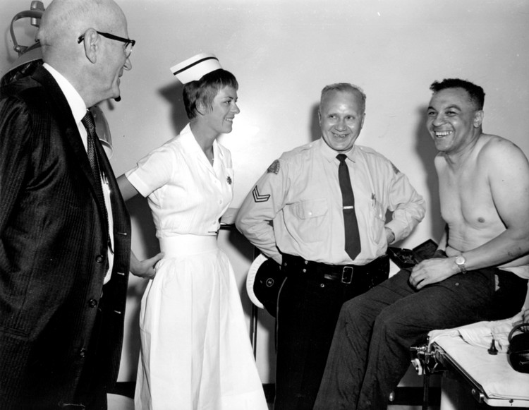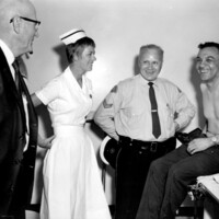 L-R: not identified, Nurse Maryann Bricker, Corporal Alex Sawada of Niagara Parks Commission Police ;