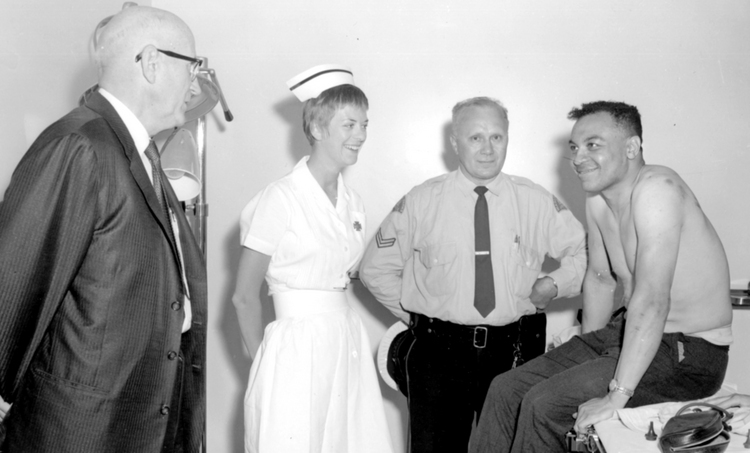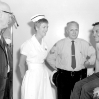 L-R: not identified, Nurse Maryann Bricker, Corporal Alex Sawada of Niagara Parks Commission Police ;