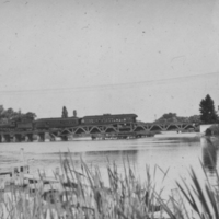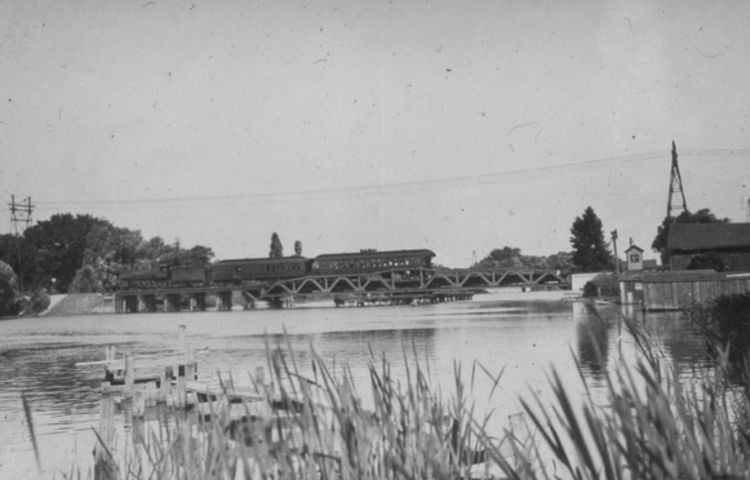- Steam train crossing a wooden trestle bridge over Chippawa Creek