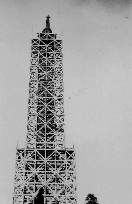 The monument is shown here covered in scaffolding ;