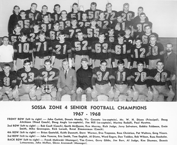 - Front Row (left to right) – John Corlett, Dennis Moody, Vic Ceccato (Co-Captain), Mr. W. H. Dixon (Principal), Doug Aitchison (Head Coach), Doug Angle (Co-Captain), Jim Hill (Co-Captain), Moreno Radolli, Paul Newton ; Second Row – Bob Coull (Coach), Garth McQueen, Ken Murray, Rich Judge, Jerry Salvatore, Rob Feldman, Ernie Smith, Mike Greenspan, Rick Larush, Brent Zimmerman (Coach) ; Third Row – John Vancea, Eric Smith, Tom English, Al Dixon, Ward Eagen, Don Taddeo, Bob Wilson, Russ Ronholm Fourth Row – Brian Gastaldi, Keith Dunnett, Dave Warner, Don Trapasso, Ross Christian, Pat Walters, Greg Vicars. Back Row – Frank Malewski (Manager), Tim Crowe, Gerry Gibbs, Jim Barr, Al Judge, Ken Shuman, Dennis Letourneau, John McRae, Glenn Arsenault (Manager).