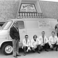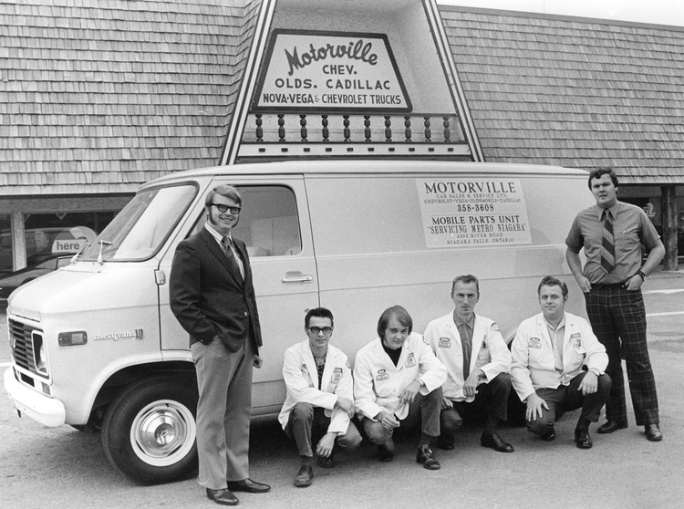 L-R: Jack Dow, Al Martin, Hugh Smith, John Fessler, Buck Hendry, ? ; sign above van reads Chevrolet Vega Oldsmobile Cadillac ; sign on van Motorville Car parts and servicing 358-3508 mobile parts unit servicing Metro Niagara ;