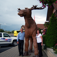 - Dave and Teresa Quinn of Australia with large wooden moose at Souvenir City Niagara Falls Ontario