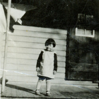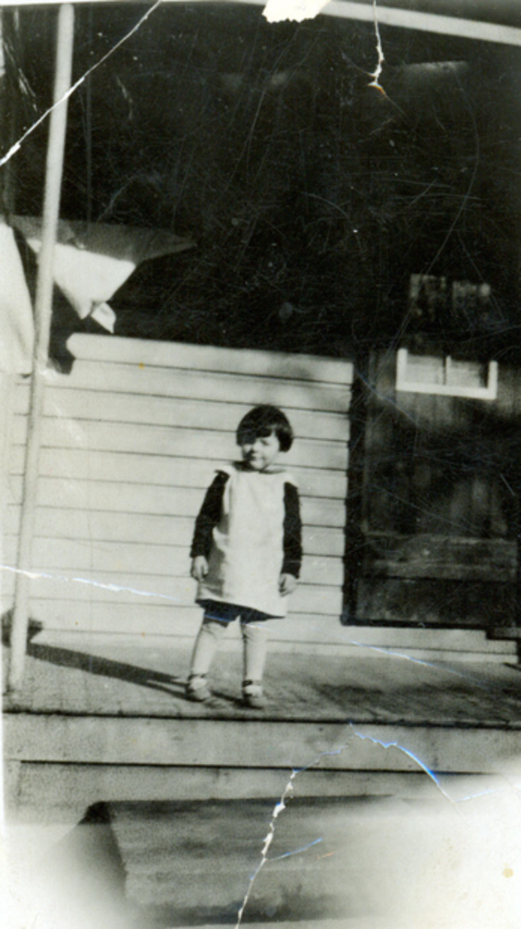 Betty Hindle (later Beam) on the veranda of the Larkin Farm Boarding House, above the escarpment, Queenston