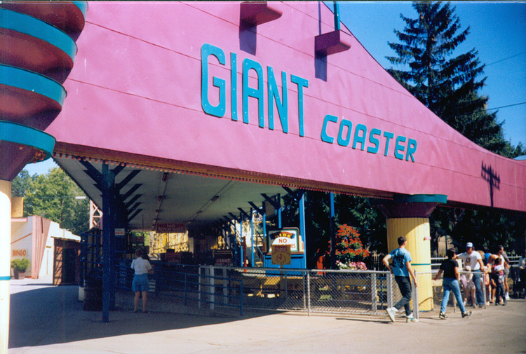 - A large overhead pink sign with blue writing says "Giant Coaster" ; people can be seen lining up to the right back of the shot ;