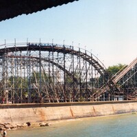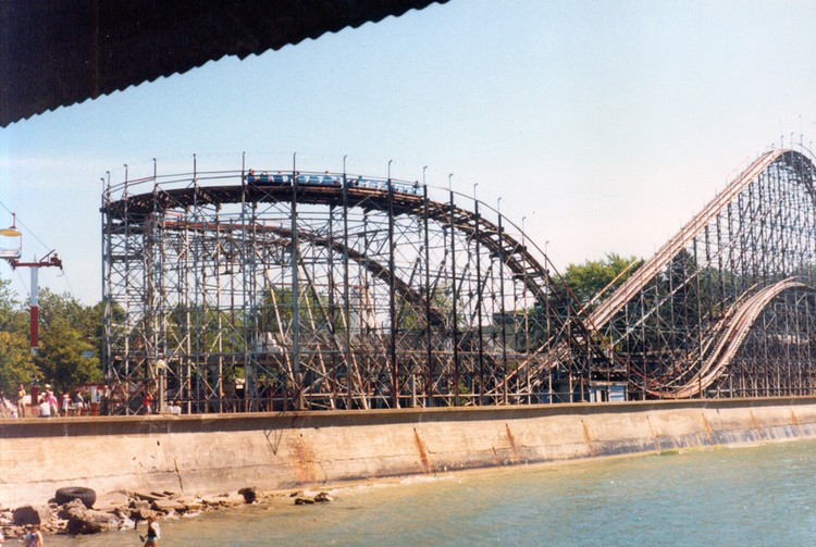 - A classic wooden roller coaster situated on the edge of Lake Erie ; this view shows a large part of the ride ; one of the cars is at the top of the ride to the left ; Lake Erie is in the foreground of the image ; small children are paddling in the water left ;