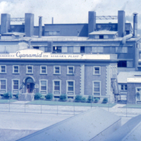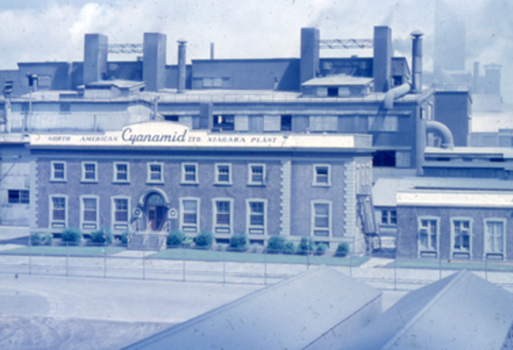 - Bird' eye view of the main office building and plant at Cyanamid ; central brick building is two story ; very large white sign reads "North American Cyanamid Ltd. Niagara Plant" on roof ; large windows on first floor and a central staircase with railings leading to the main arched doorway ; windows on second floor are much smaller ; main plant building is in background