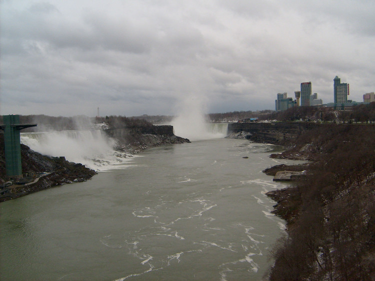 - en-CA Weather conditions in Niagara Falls when the photo was taken: Wind: west, 44 km Temp: 2° C Light snow Time: 8:37 a.m. This photo from Rainbow bridge, where concrete meets steel part of bridge.