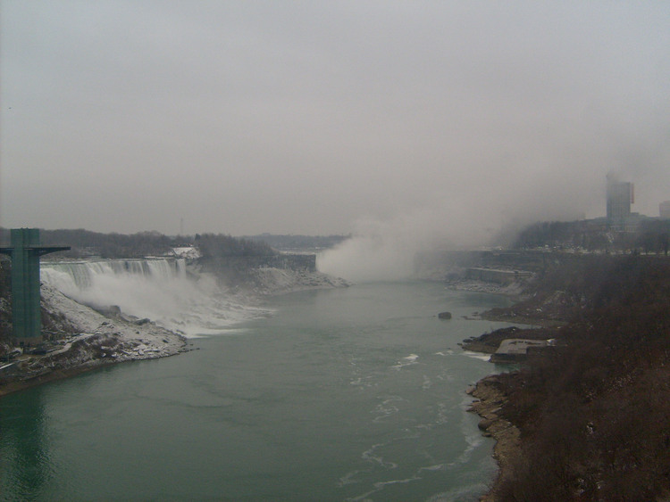 - en-CA Weather conditions in Niagara Falls when the photo was taken: Wind: south southeast, 11 km Temp: 1° C Overcast Time: 8:43 a.m. This photo from Rainbow bridge, where concrete meets steel part of bridge.