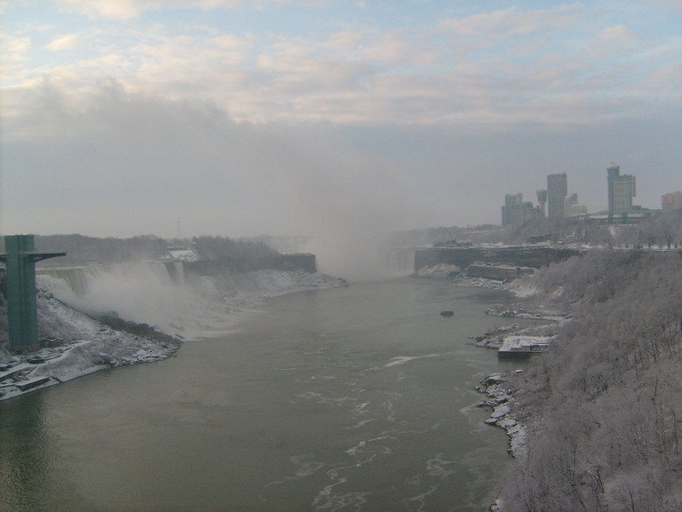 - en-CA Weather conditions in Niagara Falls when the photo was taken: Wind: southwest, 18 km Temp: 3° C Cloudy Time: 8:23 a.m. This photo from Rainbow bridge, where concrete meets steel part of bridge.