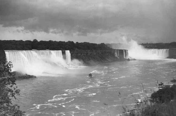 - en-CA Both the American and Horseshoe Falls are seen. One Maid of the Mist ship is seen passing in front of the American Falls with another docked to the right.