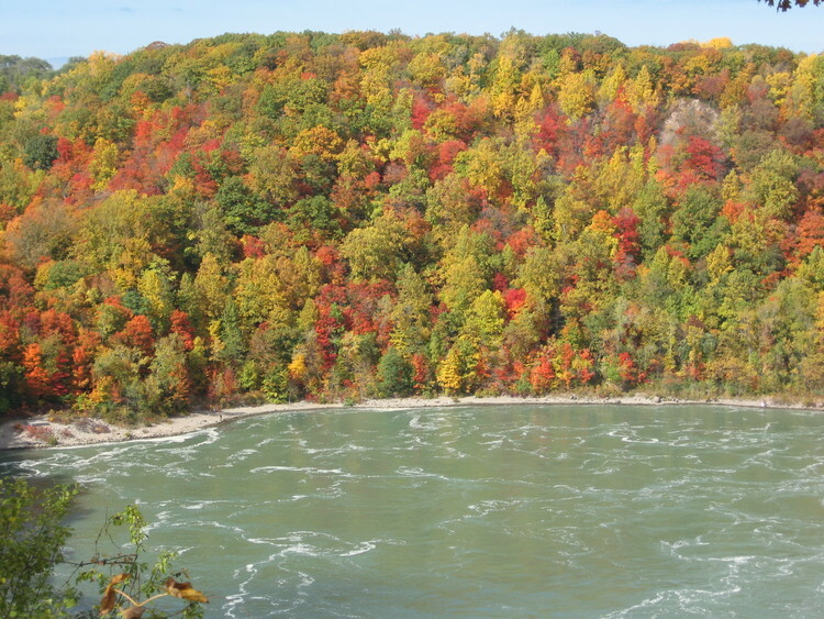 - en-CA Fall colours at the whirlpool rapids taken from the sidewalk at the Spanish Aero Car building.