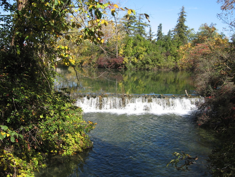 - en-CA Fall colours on the trees by the small waterfall at Dufferin Islands.