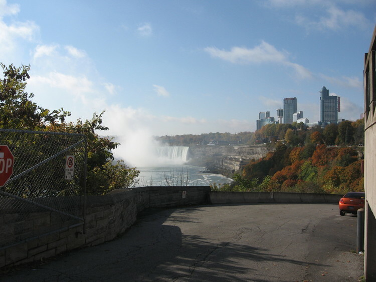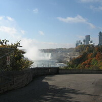 en-CA Fall colours, as seen from the Maid of the Mist receiving area. Part of the Horseshoe falls and the old Ontario Power generating station are visble in the background.