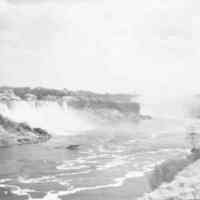 en-CA American Falls, Horseshoe Falls, Lower Niagara River with the maid of the Mist and the Observation Tower can be seen on the American side of the gorge.