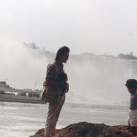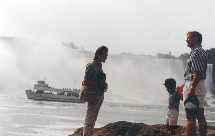 - en-CA Roger Woodward with family returns to Niagara Falls on the 30th anniversary of his plunge over the Horseshoe falls. Roger Woodward with his son talking to a reporter on the banks of the lower Niagara River. The Maid of the Mist can be seen in the background.