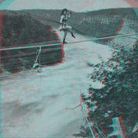 en-CA Signorina Maria Spelterini crossing the Niagara gorge above the rapids balancing on one foot.