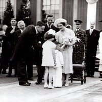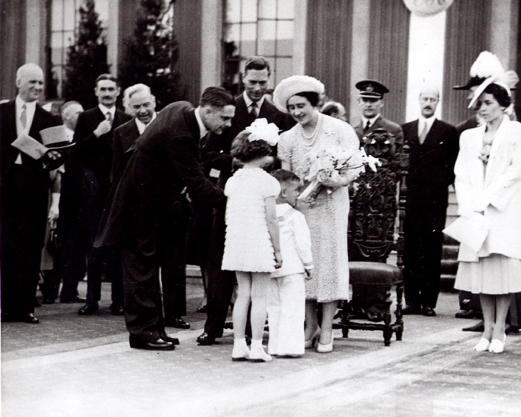 - en-CA 1939 Royal Tour. "Presentation of flowers to Queen Elizabeth by David Hanniwell and Eleanor Donald. Carl Hanniwell, then Mayor of Niagara Falls, is bending over, forcing the bouquet of flowers from David's hands. David refused to present the flowers because 'They are not wearing their king's hats' Hon. Mackenzie King, Prime Minister of Canada (standing behind Dr. Hanniwell), found this to be amusing.