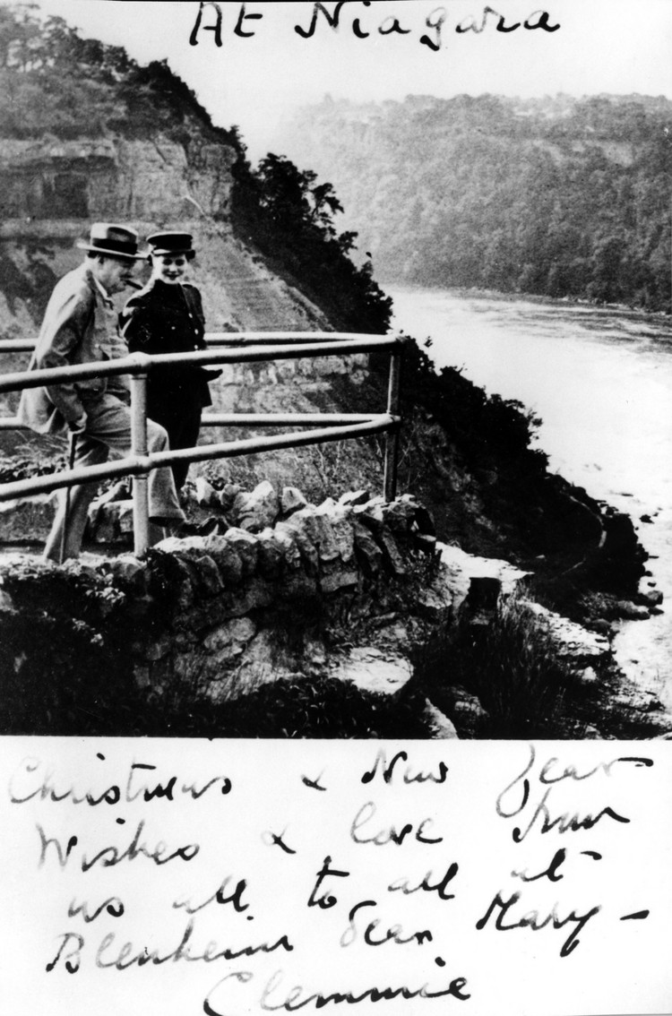 - hand written note signed by Clementine Churchill reads At Niagara - Christmas & New Years wishes & love from us all to all at Blenheim [undecipherable] Mary - Clemmie