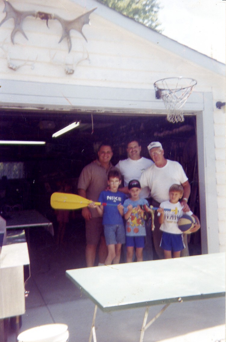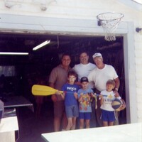 - handwritten note on back of photograph reads Jesse Sharpe's paddle, 3 men in background Mark Defancesio, Mike Defancesio, Wes Hill (U.S.side)