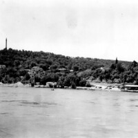 Queenston Dock from the deck of the Cayuga, Brock's Monument in background