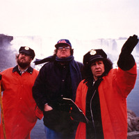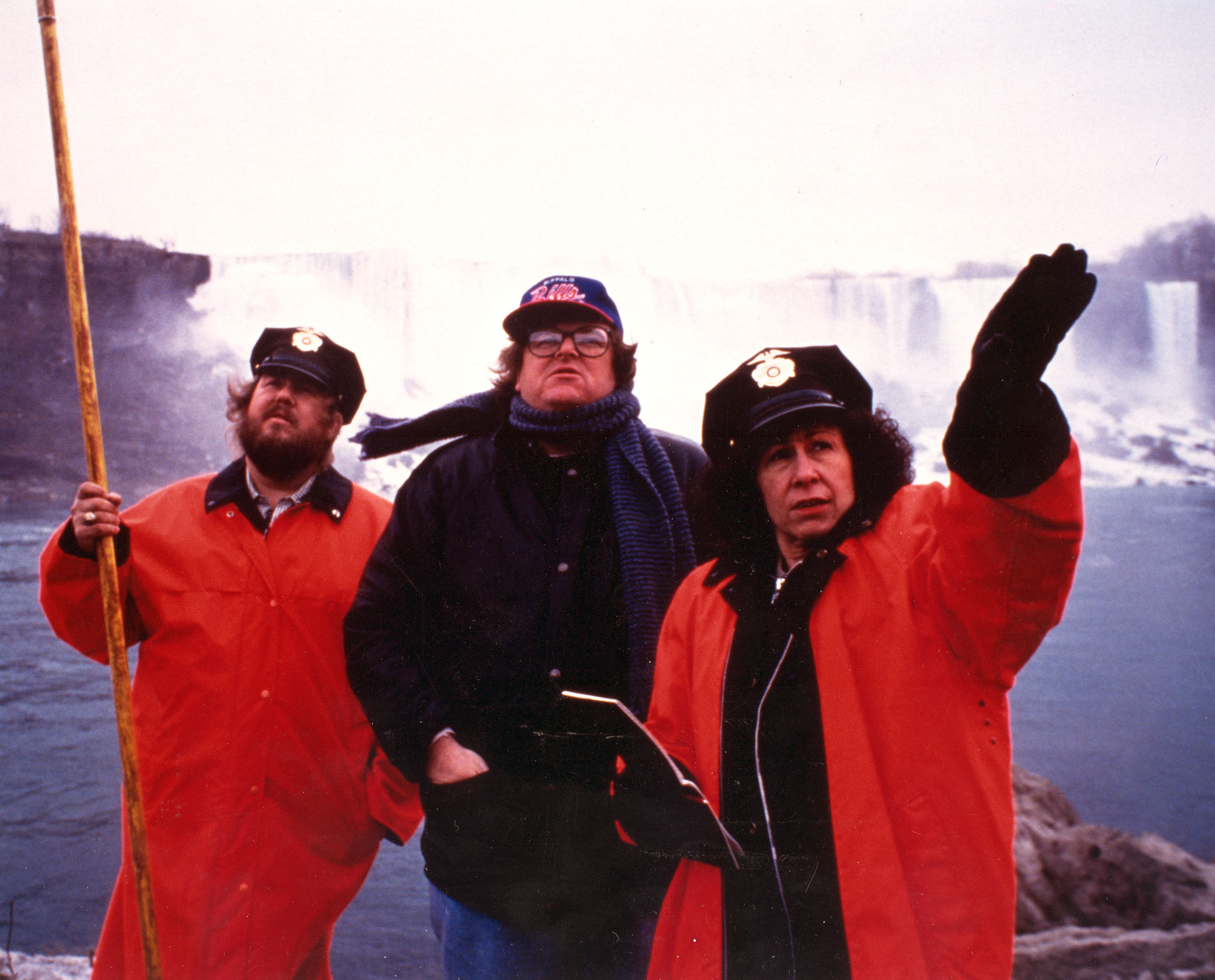 John Candy, director Michael Moore & Rhea Perlman during filming of Canadian Bacon at Niagara Falls
