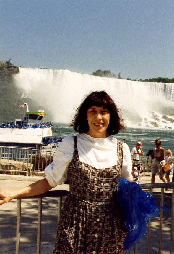 - Lily Tomlin on the landing dock of the Maid of the Mist, American Falls in background
