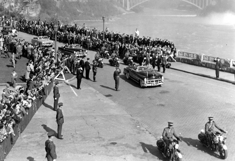 Royal motorcade of Princess Margaret in Queen Victoria Park, Rainbow Bridge in background