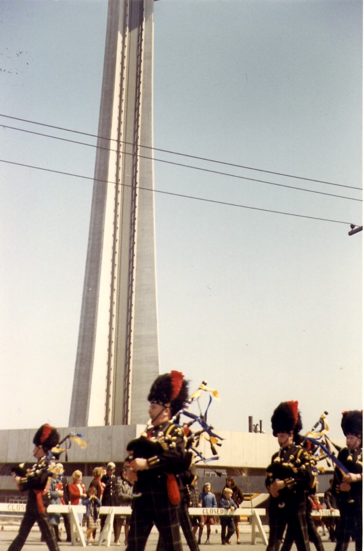 - Blossom Festival Parade - Police Pipe Band in front of the Skylon Tower Niagara Falls