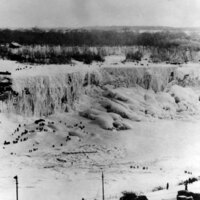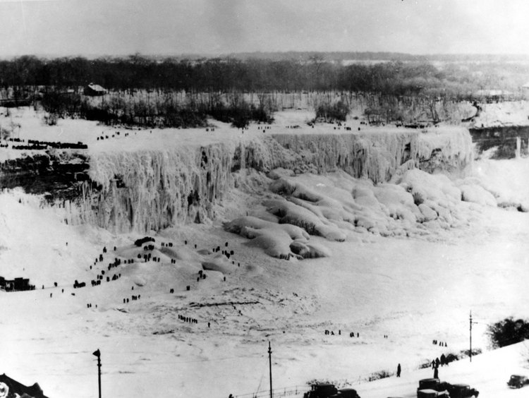 - en-CA The miraculous result of a cold winter, the American Falls completely froze in 1936. Notice the tiny human forms at the base of the Falls giving an idea of the density of the ice.