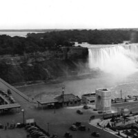 - General view showing Falls View Bridge, American Falls, Memorial Arch, Oakes Garden Theatre