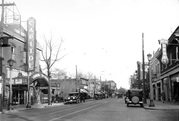 - en-CA Queen St., & St. Clair Ave. ca 1929-1930. The capitol Theatre was torn down to make way for Lincoln Trust and is now Canada/Trust. Pew Drug store on the right was later the site of Thorburn Drugs and presently the site of CJRN radio